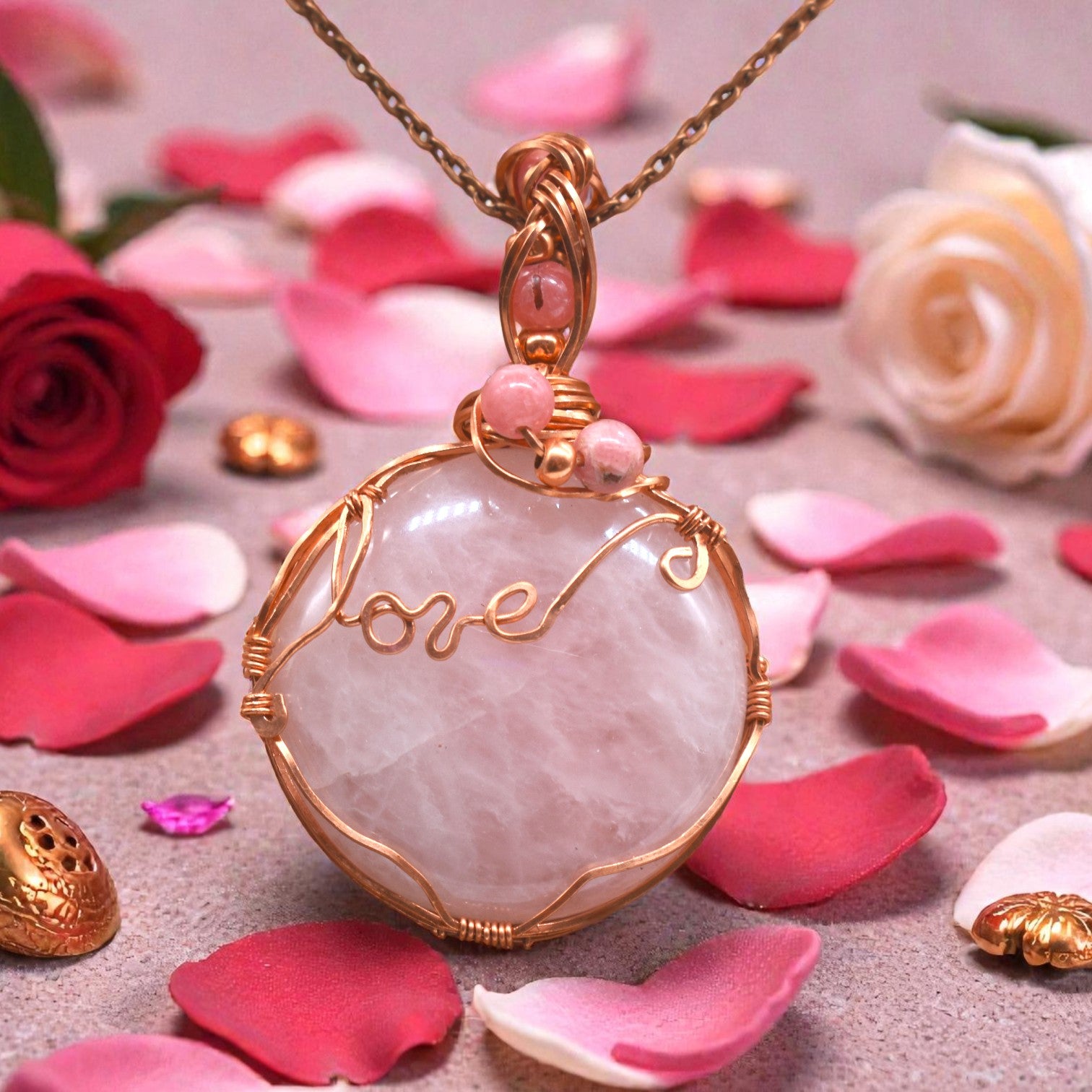This one-of-a-kind pendant is a true statement of heart-centered beauty and sacred craftsmanship. Featuring soft Rose Quartz and richly colored Rhodolite Garnet, this piece is intricately wire wrapped with warm copper bead accents and finished with a braided veil detail, creating a design that feels both ancient and elegant.
